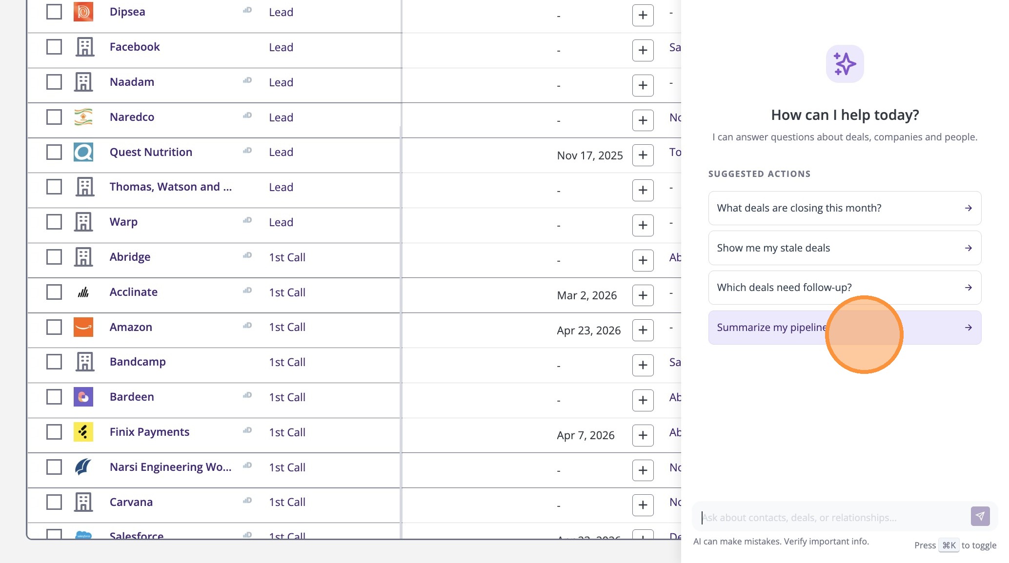 3. You can start with a suggested action, like ‘Summarize my pipeline,’ to get insights instantly.